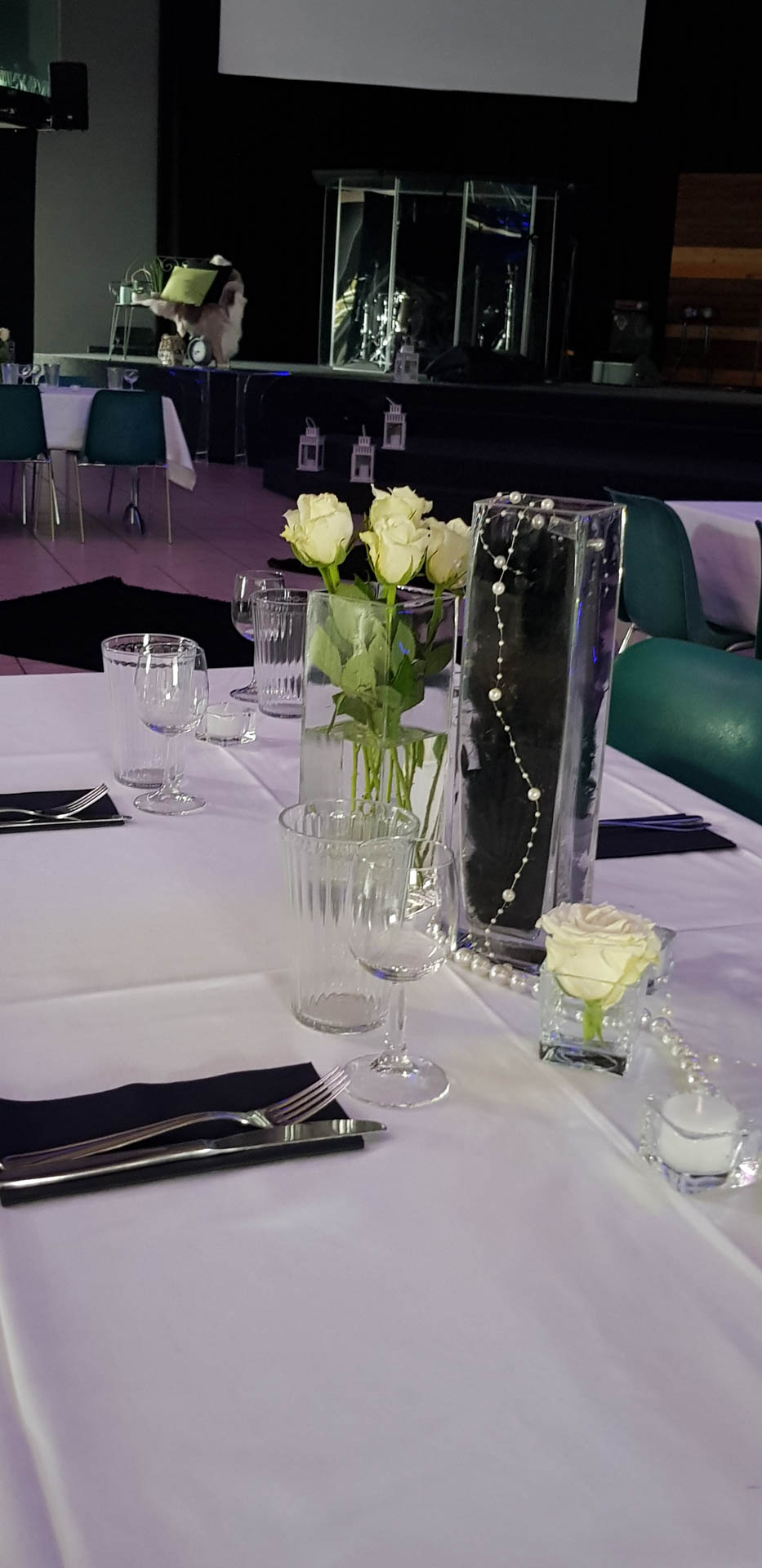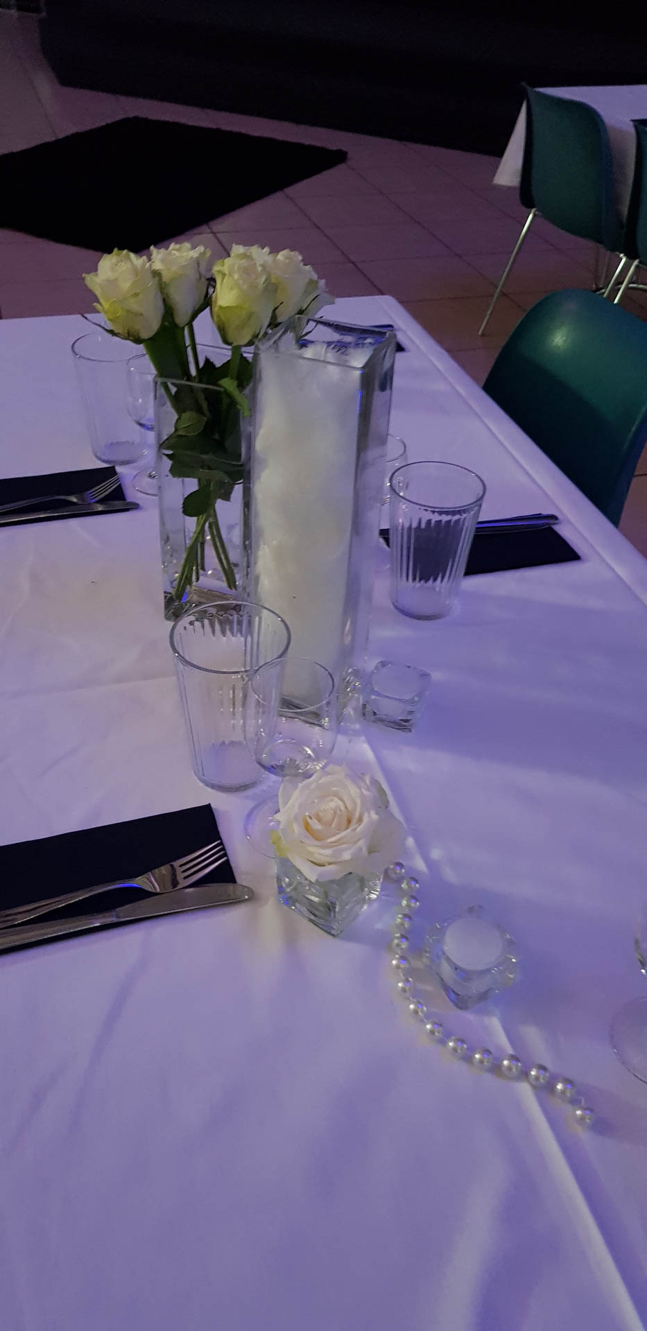 Pour une soirée dédiée aux célibataires, j’ai conçu une décoration élégante et chaleureuse. Roses blanches, perles nacrées et bougies étaient au cœur de l’ambiance, apportant douceur et lumière.